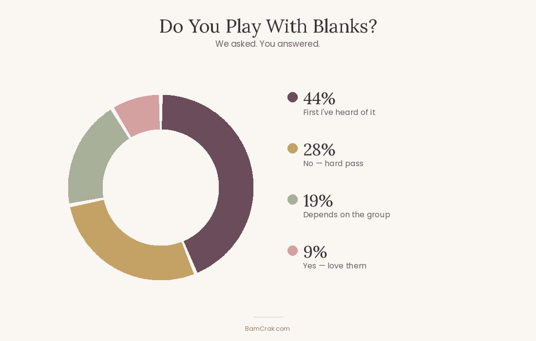 The biggest group by far (44%) had never even heard of blanks, which honestly makes sense. Blanks aren't part of the official NMJL rules, and unless someone at your table specifically introduced them as a house rule, there's no real reason you'd know they exist. About 28% said no, hard pass, they know what blanks are and want nothing to do with them. 19% said it depends on the group, which is the most diplomatic answer possible. Only 9% are committed blanks fans who play with them every chance they get.